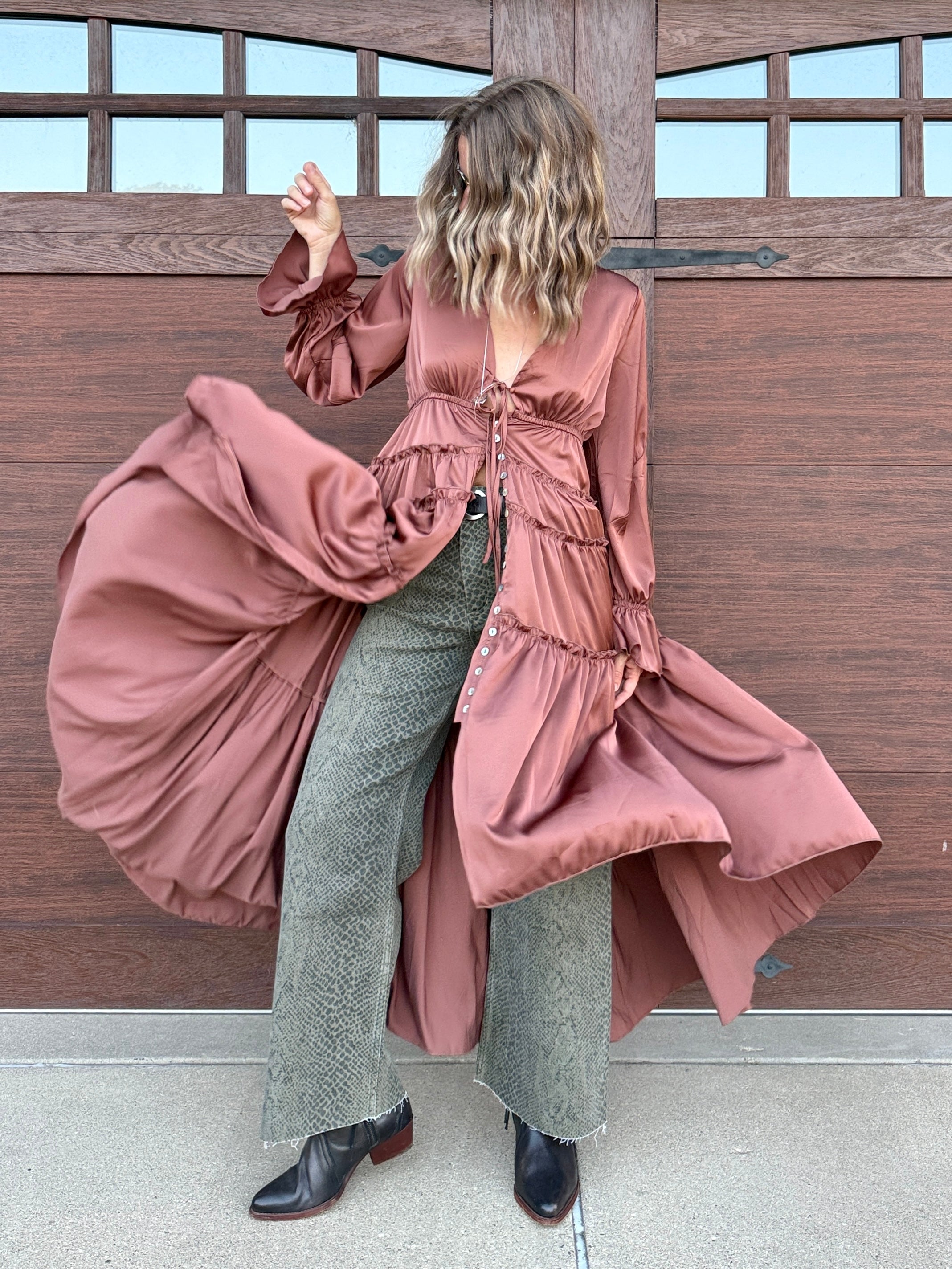 Plunging neckline with tie closures.